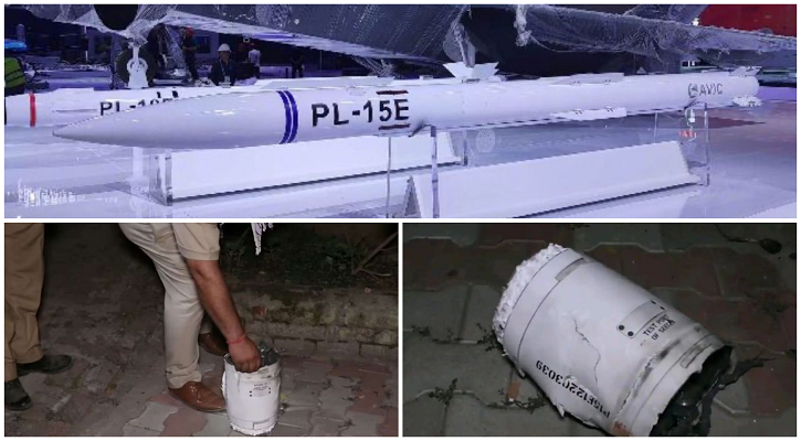 নিচের ছবিতে ভারতীয় পুলিশ যে মিসাইলের ধ্বংসাবশেষটি পরীক্ষা করছে তা পিএল-১৫ ক্ষেপণাস্ত্রের বলে নিশ্চিত করছে এই ইস্যুতে নিরপেক্ষ ডিফেন্স এন্থুজিয়াস্টরা।