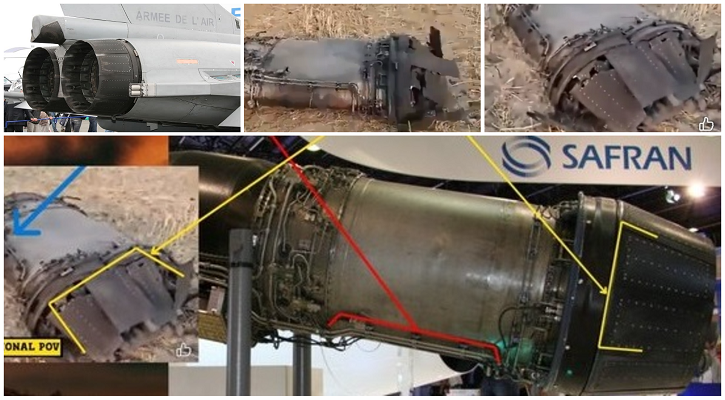 ভারতের পাঞ্জাবে বিধ্বস্ত ওই যুদ্ধবিমানের ধ্বংসাবশেষের ভিডিও-ছবি বিশ্লেষণ করে ডিফেন্স এন্থুজিয়াস্টরা এটি যে রাফাল নয় তা জোর দিয়ে বলতে পারছেন না। নিচের ছবিতে দেখা যাচ্ছে বিধ্বস্ত ওই যুদ্ধবিমানের ইঞ্জিন নজেল আর রাফালের ইঞ্জিন নজেল দেখতে একই।